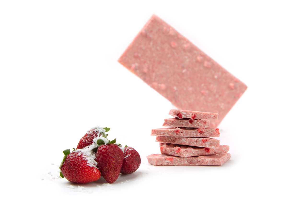 ქოქოსი და სუბლიმირებული მარწყვი – თეთრ შოკოლადში (30%)